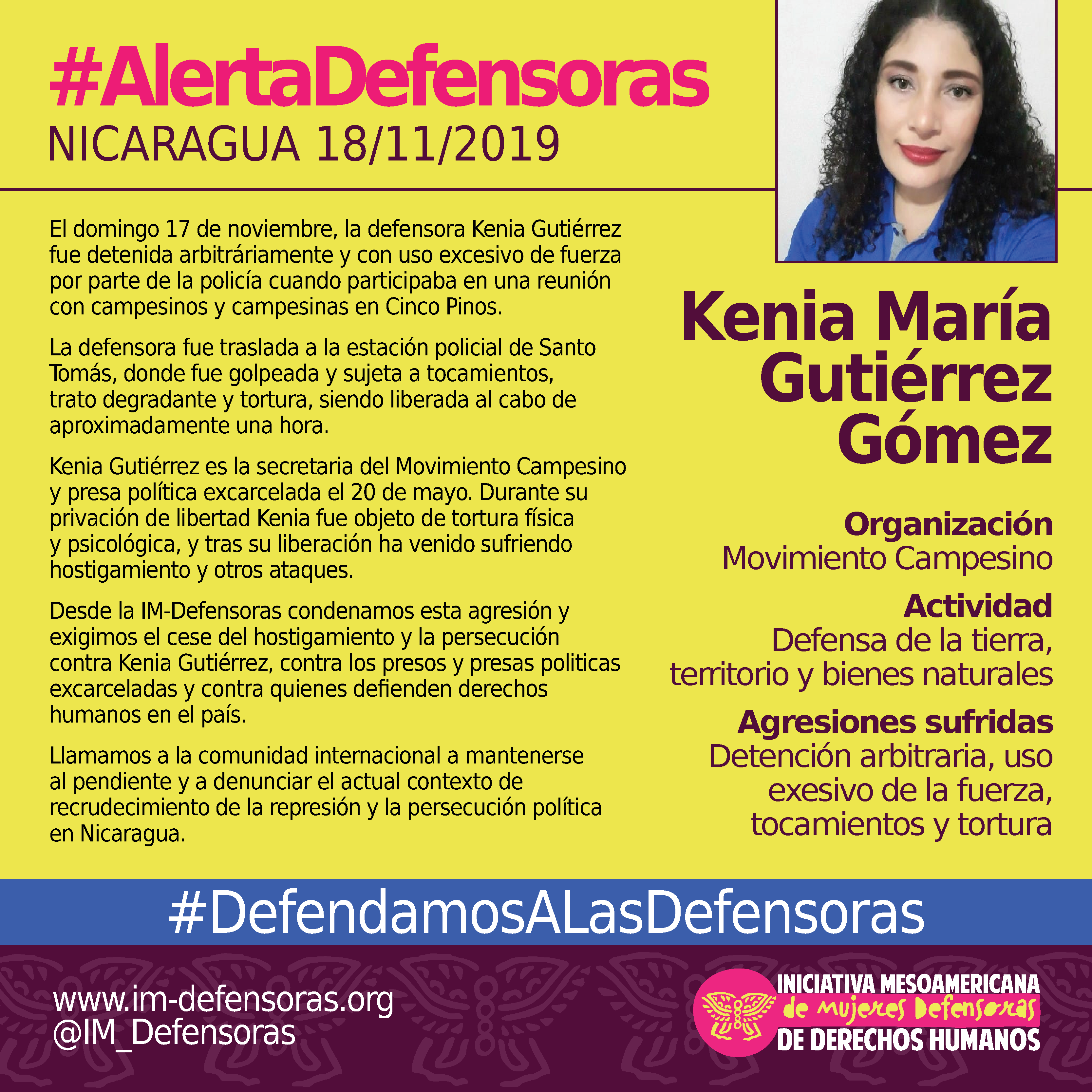 Desde la IM-Defensoras condenamos esta agresión y exigimos el cese del hostigamiento y la persecución contra Kenia Gutiérrez, contra los presos y presas politicas excarceladas y contra quienes defienden derechos humanos en el país.