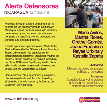 Entre las personas agredidas están María Avilés, Martha Flores, Grethel Gómez y Juana Francisca Reyes Urbina (quien fue agredida por un simpatizante del gobierno), todas ellas madres de presos y presas políticas; así como la periodista del Canal 12 Kastalia Zapata, a quien la policía además de golpear ha sustraído el celular que estaba usando para realizar su trabajo.
