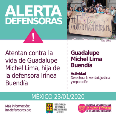 HECHOS - El pasado lunes, 20 de enero de 2020, un sujeto desconocido atentó contra la vida de Guadalupe Michel Lima, hija de la defensora Irinea Buendía, disparando al menos en seis ocasiones contra el auto del cual ella acababa de descender. Guadalupe salvó su vida gracias a la oportuna intervención de la escolta que la acompañaba.