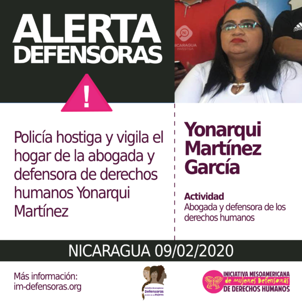 Yonarqui Martínez es una reconocida abogada que en el marco de la crisis socio-política y de derechos humanos que desde abril de 2018 sufre Nicaragua, ha destacado por su acompañamiento a personas presas políticas. Por este motivo ha venido siendo objeto reiterado de ataques de diversa índole, incluyendo criminalización, amenazas y detenciones arbitrarias además de los ya citados.