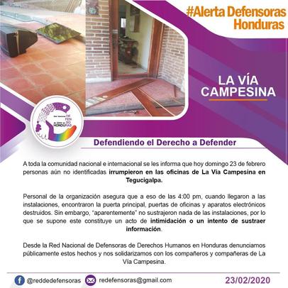 A toda la comunidad nacional e internacional se les informa que hoy domingo 23 de febrero personas aún no identificadas irrumpieron en las oficinas de La Vía Campesina en Tegucigalpa.