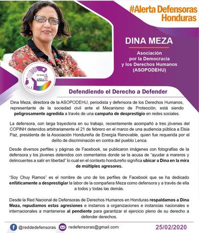 Desde la Red Nacional de Defensoras de Derechos Humanos en Honduras respaldamos a Dina Meza, repudiamos estas agresiones e instamos a organizaciones e instancias nacionales e internacionales a mantenerse al pendiente para garantizar el ejercicio pleno de su derecho a defender derechos.