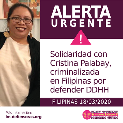 Desde la IM-Defensoras expresamos nuestra solidaridad con Cristina Palabay, Karapatan y el resto de personas y organizaciones que están siendo atacadas por el gobierno filipino; exigimos el cese inmediato de la criminalización en su contra y garantías para que se respete su seguridad, su integridad física y moral y su derecho a defender derechos.