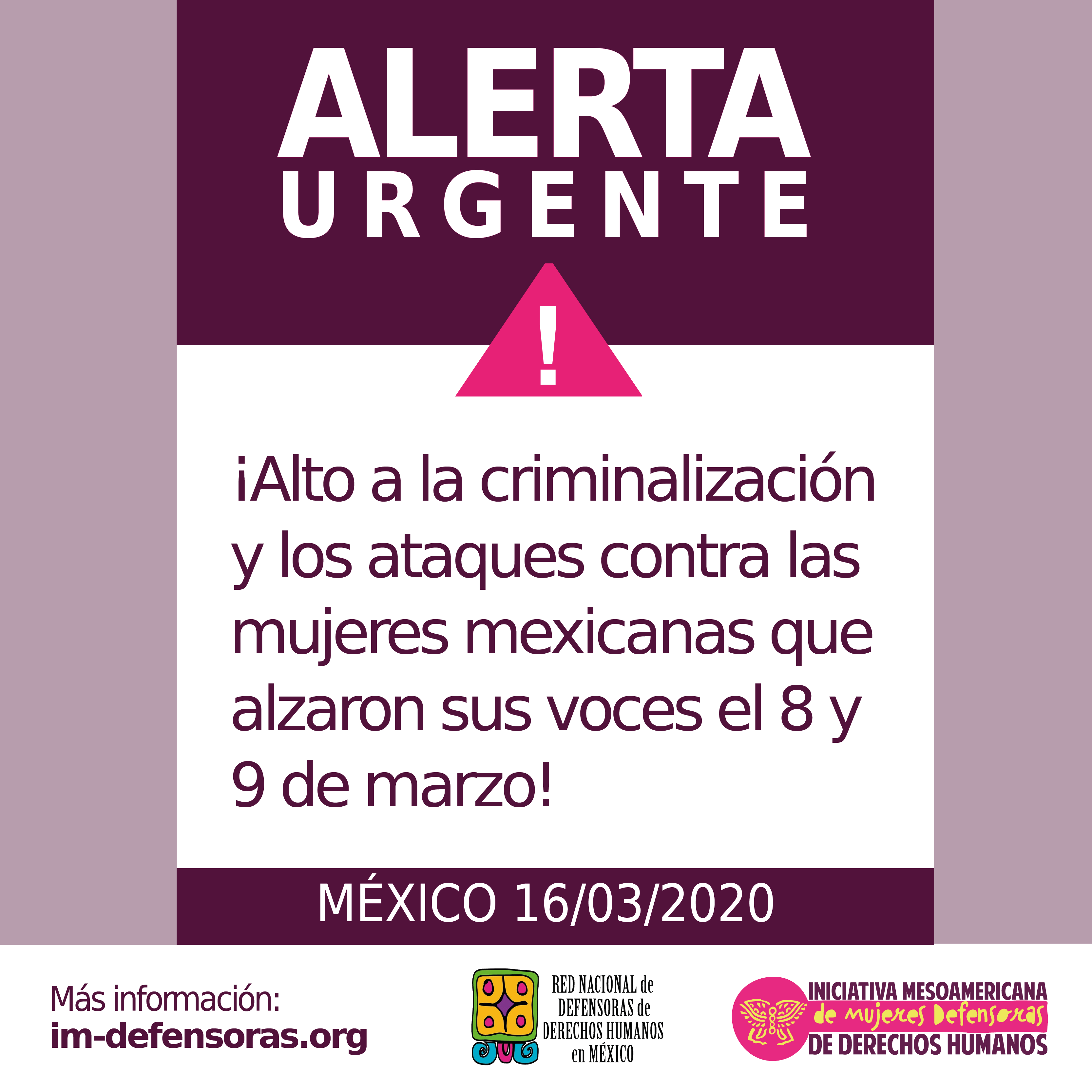 México, Mesoamérica, 16 de marzo de 2020 - La Iniciativa Mesoamericana de Mujeres Defensoras de Derechos Humanos (IM-Defensoras) y las 279 defensoras de derechos humanos y periodistas, de 27 estados de la República, de la Red Nacional de Defensoras de Derechos Humanos en México (RNDDHM), expresamos preocupación por las agresiones, actos de represión y criminalización que enfrentan las defensoras, periodistas, madres, hermanas, jóvenes y niñas que participaron en las acciones del 8 y 9 de marzo en las entidades de la República Mexicana.