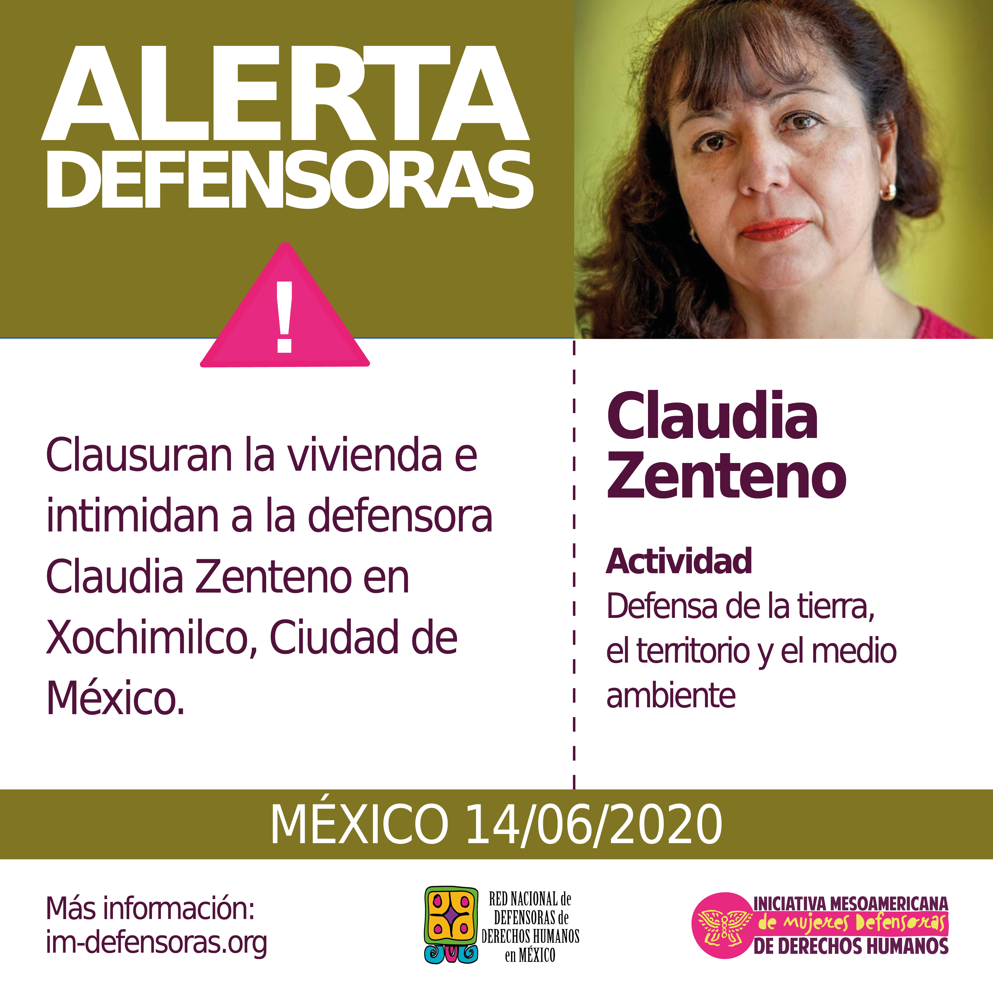Desde la Red Nacional de Defensoras de Derechos Humanos en México y la IM-Defensoras denunciamos estas acciones, las cuales consideramos que tienen un carácter intimidatorio cuyo objetivo es inhibir y sancionar la importante labor de defensa del territorio que desde hace veinte años está llevando a cabo Claudia Zenteno en Xochimilco.