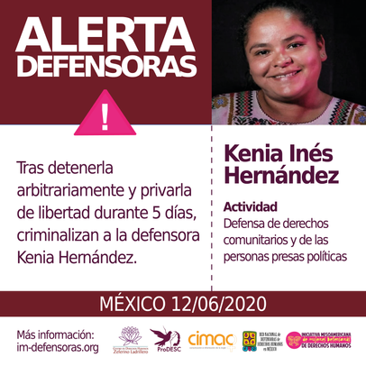 Desde la Red Nacional de Defensoras de Derechos Humanos en México, ProDESC, el Centro de Derechos Humanos Zeferino Ladrillero, CIMAC, la Red de Apoyo a Kenia Hernández y la IM-Defensoras exigimos el retiro total de los cargos en contra de la Defensora Kenia Hernández, quien desde 2019 es beneficiaria del Mecanismo Federal de Protección a Personas Defensoras y de Derechos Humanos y Periodistas, así como el respeto de sus derechos humanos y garantías de no repetición.