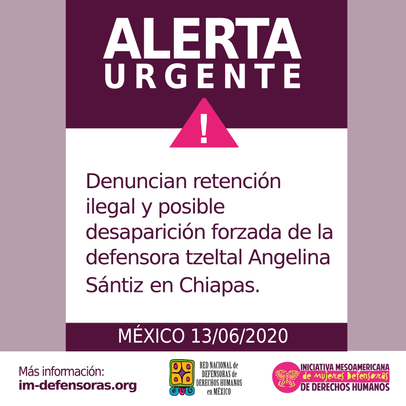 Desde la IM-Defensoras y la Red Nacional de Defensoras de Derechos Humanos en México demandamos la inmediata presentación con vida de Angelina Sántiz López y su esposo, y exigimos al Estado mexicano que tome todas las medidas necesarias para buscar a estas personas, localizarlas y garantizar su protección e integridad física y psicológica.