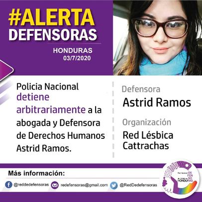 Ayer jueves 2 de julio, a las 6:30 de la tarde, la abogada y compañera Defensora de Derechos Humanos, Astrid Ramos, fue agredida y detenida de manera arbitraria por elementos de la Policía Nacional departamental de Comayagua, cuando ejercía su labor de representación legal y defensoría de Derechos Humanos.