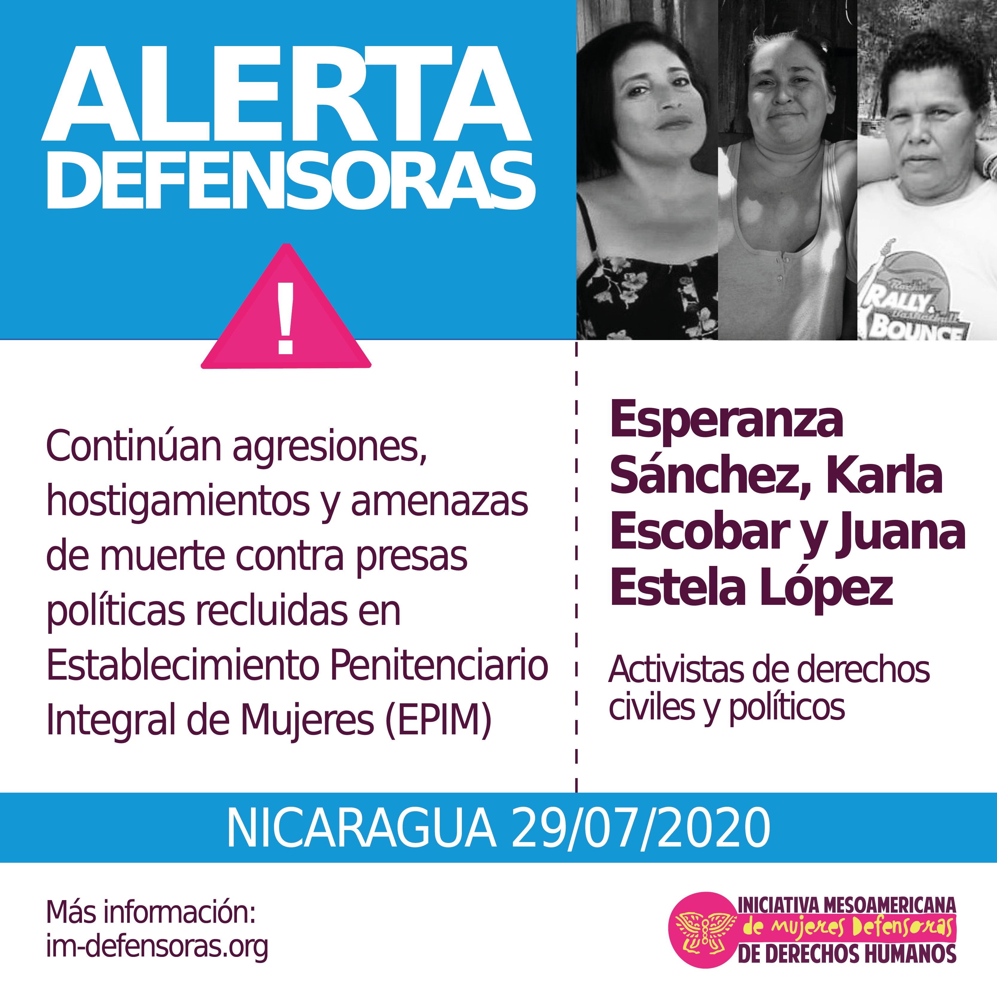 Desde la IM-Defensoras repudiamos el clima de agresión y amenazas que enfrentan en la cárcel las presas políticas Esperanza Sánchez, Juana Estela López y Karla Escobar, y hacemos responsable al Estado nicaragüense de sus vidas y su integridad física, moral y psicológica.