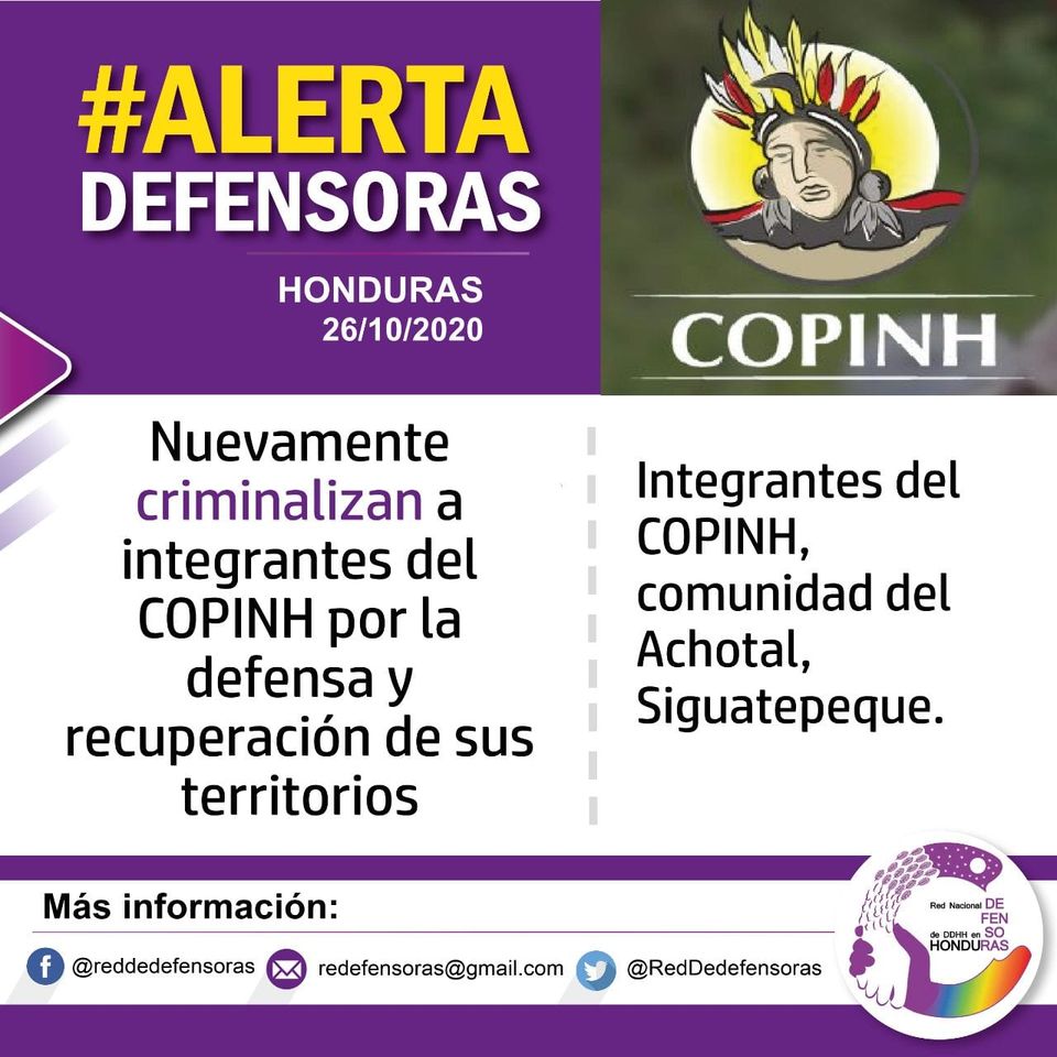 Desde la Red Nacional de Defensoras de Derechos Humanos en Honduras condenamos la sistemática persecución y criminalización de la defensa del territorio que además coloca en riesgo la seguridad alimentaria y la vida misma de los y las defensoras y sus familias al negarles el derecho a trabajar por su sustento.