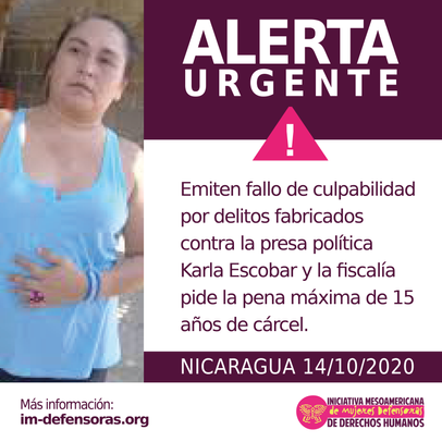 En la mañana de este miércoles 14 de octubre, un juez ha emitido fallo de culpabilidad contra la presa política Karla Escobar por delitos fabricados contra ella de “tráfico de estupefacientes y portación ilegal de armas”. Además, el ministerio público ha solicitado para Karla la pena máxima estipulada para estos delitos, consistente en 15 años de cárcel y mil días multa.