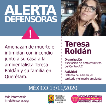 HECHOS - El pasado viernes 6 de noviembre, personas desconocidas arrojaron una carta en el domicilio de la defensora ambientalista Teresa Roldán en el municipio de Corregidora, Estado de Querétaro, en la que se vertían amenazas de muerte hacia ella y su familia junto con un ultimátum para que abandonara el Estado de Querétaro. Dos días después, el 8 de noviembre, mientras ella había salido al mercado, alguien provocó un incendio en los terrenos baldíos aledaños a su casa, donde se encontraban sus hijos durmiendo.