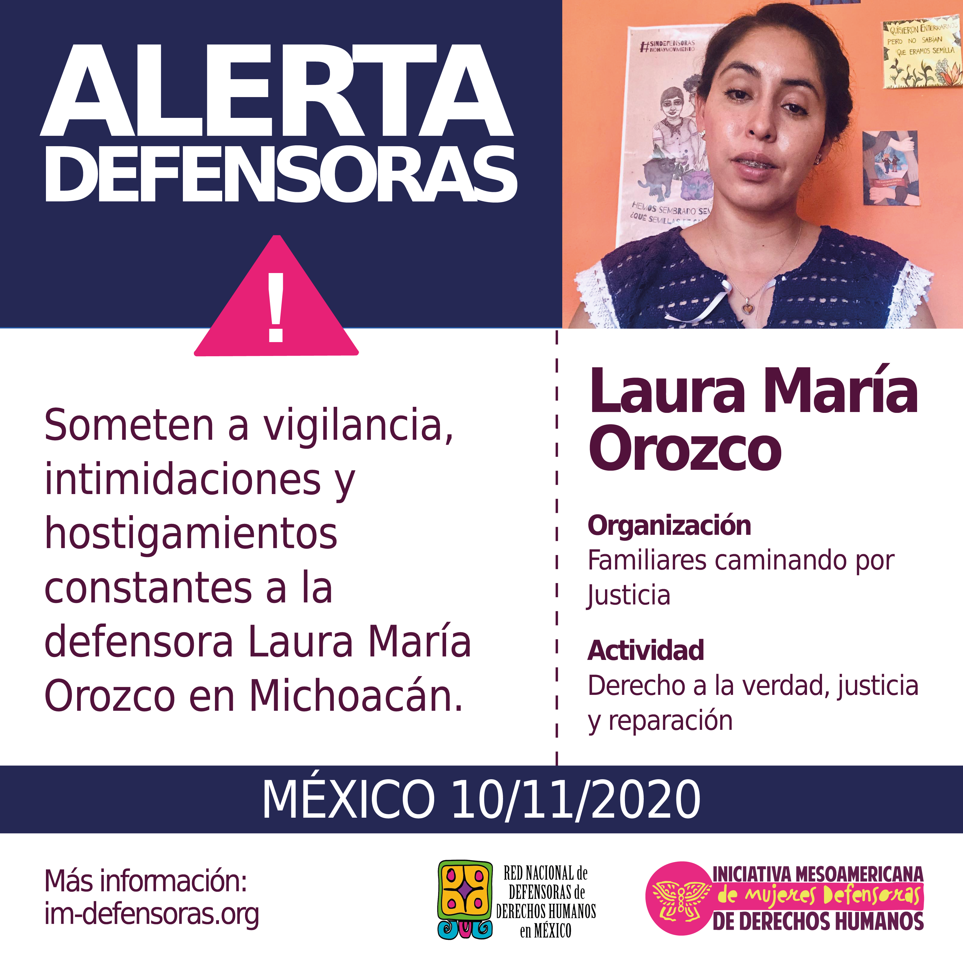 Desde la IM-Defensoras y la Red Nacional de Defensoras de Derechos Humanos en México exigimos a las autoridades de todos los niveles del Estado de Michoacán y del Gobierno Federal el cese de las graves agresiones contra la defensora Laura Orozco, su familia y colectiva “Familiares caminando por Justicia”, así como garantías para su seguridad y para que puedan seguir desarrollando su labor de defensa de derechos humanos.
