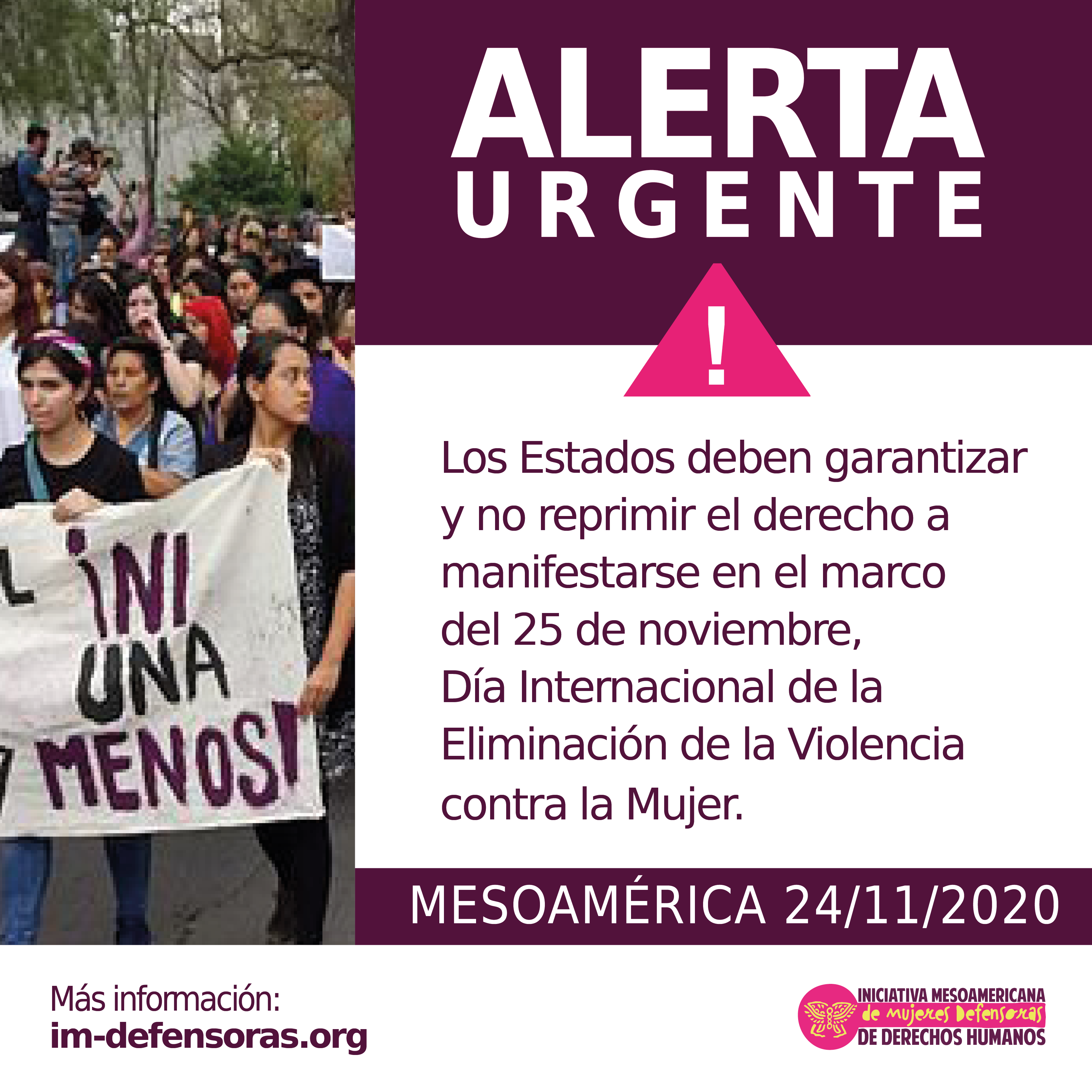 Desde la IM-Defensoras reconocemos y agradecemos el papel fundamental que las organizaciones, colectivas y movimientos feministas, de mujeres y otras identidades no binarias, las compañeras activistas y defensoras de derechos humanos que las integran, así como madres y familiares de víctimas, entre otras, desarrollan día tras día para denunciar y combatir las violencias machistas y exigir justicia ante las mismas. Por ello, en un día como el 25 de noviembre, saludamos todas las expresiones dirigidas a visibilizar estas violencias, repudiarlas y exigir medidas efectivas para su erradicación.