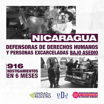 Durante los últimos seis meses, los registros de la IM-Defensoras, UDR y UDJ reflejan una suma agregada de 916 actos de hostigamiento, documentados en 14 de los 15 departamentos del país y en las dos regiones autónomas, que evidencian que el Estado de Nicaragua promueve una política de persecución generalizada y sistemática contra ciertos grupos de interés para obstaculizar sus labores de fiscalización al poder del Estado y denuncia de violaciones a derechos humanos. Los dos grupos de los que estas organizaciones tienen registros son mujeres defensoras de derechos humanos, personas que son o han sido presas políticas y familiares de estas últimas. Cabe destacar que 12 de los hostigamientos registrados estuvieron dirigidos contra el CENIDH y la CPDH, contradiciendo la versión y la tergiversación de la realidad ofrecida por la representante del gobierno nicaragüense.