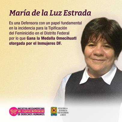 2011 María de la Luz Estrada tuvo un papel fundamental en la incidencia con la Asamblea Legislativa del Distrito Federal (ALDF) logrando la aprobación de la Tipificación del Feminicidio en el Distrito Federal por lo que Gana la Medalla Omecíhuatl otorgada por el Inmujeres DF.