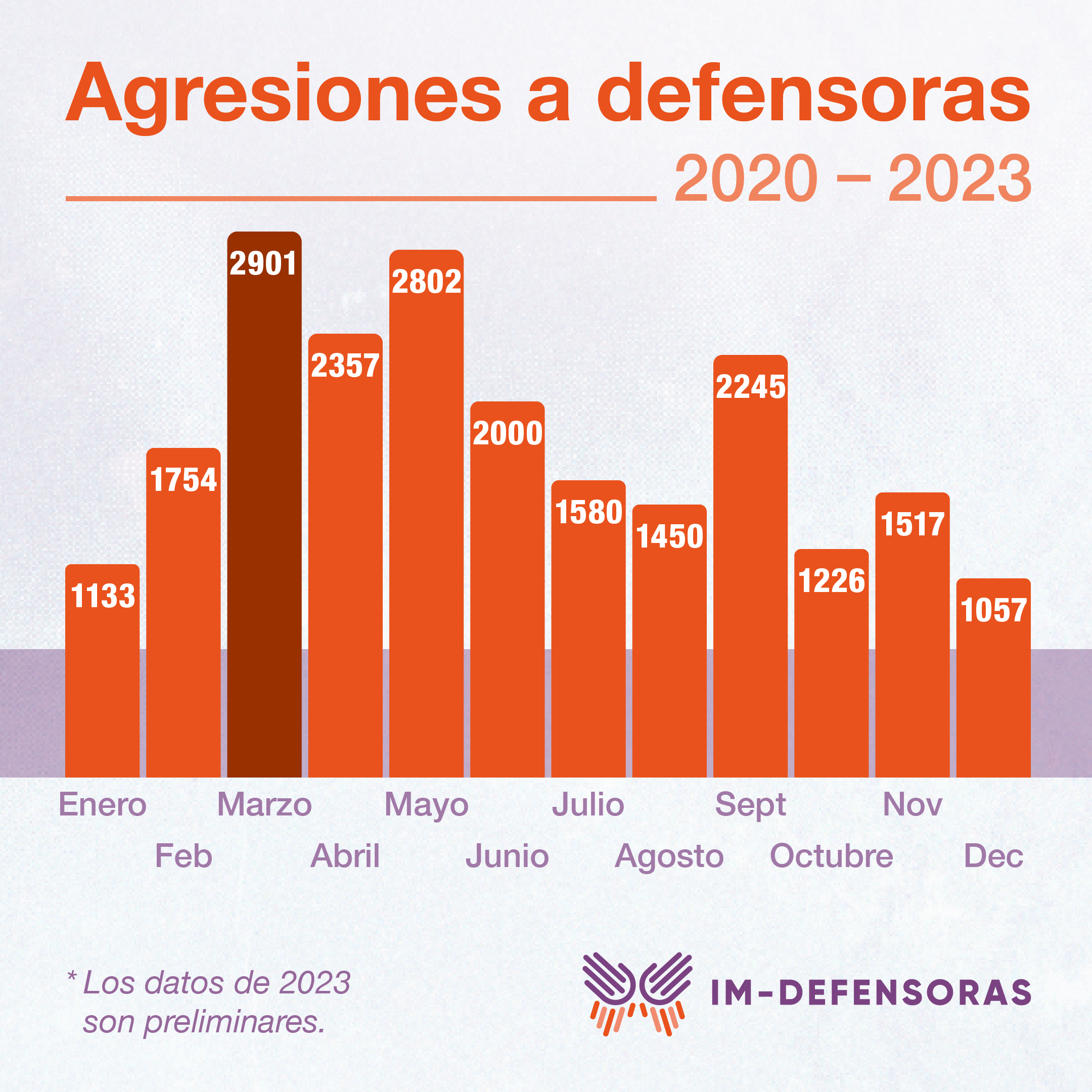 Un análisis retrospectivo de lo documentado en nuestro registro da cuenta de cómo durante los últimos años el mes de marzo ha sido el mes que ha marcado el pico anual más elevado de agresiones contra defensoras. Así, durante los meses de marzo de los últimos cuatro años, de 2020 a 2023, registramos 2,901 agresiones en México, Honduras, El Salvador y Nicaragua.