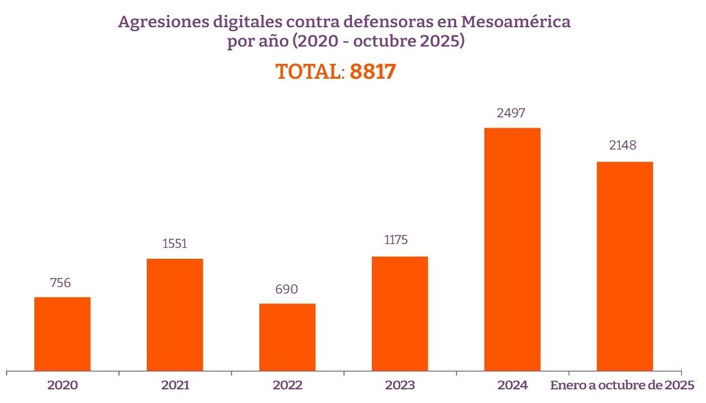 Las defensoras mesoamericanas enfrentamos contextos cada vez más complejos, donde el incremento de las agresiones digitales y la disputa por el territorio digital son una constante. Entre 2020 y el 31 de octubre de 2025, nuestro Registro mesoamericano de agresiones ha documentado un total de 8,817 agresiones digitales contra 1312 defensoras y 174 organizaciones en El Salvador, Honduras, México y Nicaragua. Esto representa una de cada cuatro agresiones registradas durante el mismo período.