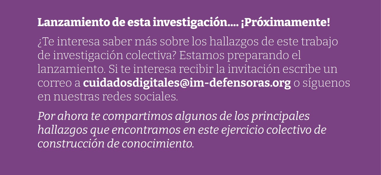 Para esto se realizaron procesos de investigación simultáneos en Honduras, El Salvador, Nicaragua y México, que incluyeron entrevistas a defensoras y personas especialistas en seguridad digital en la región, encuestas, análisis de marcos legales y revisiones bibliográficas. Gracias al trabajo conjunto con las redes de cada país y el apoyo de feministas expertas en protección y cuidados digitales, pudimos identificar y entender las diferentes formas en que las defensoras de Mesoamérica nos relacionamos con las tecnologías.