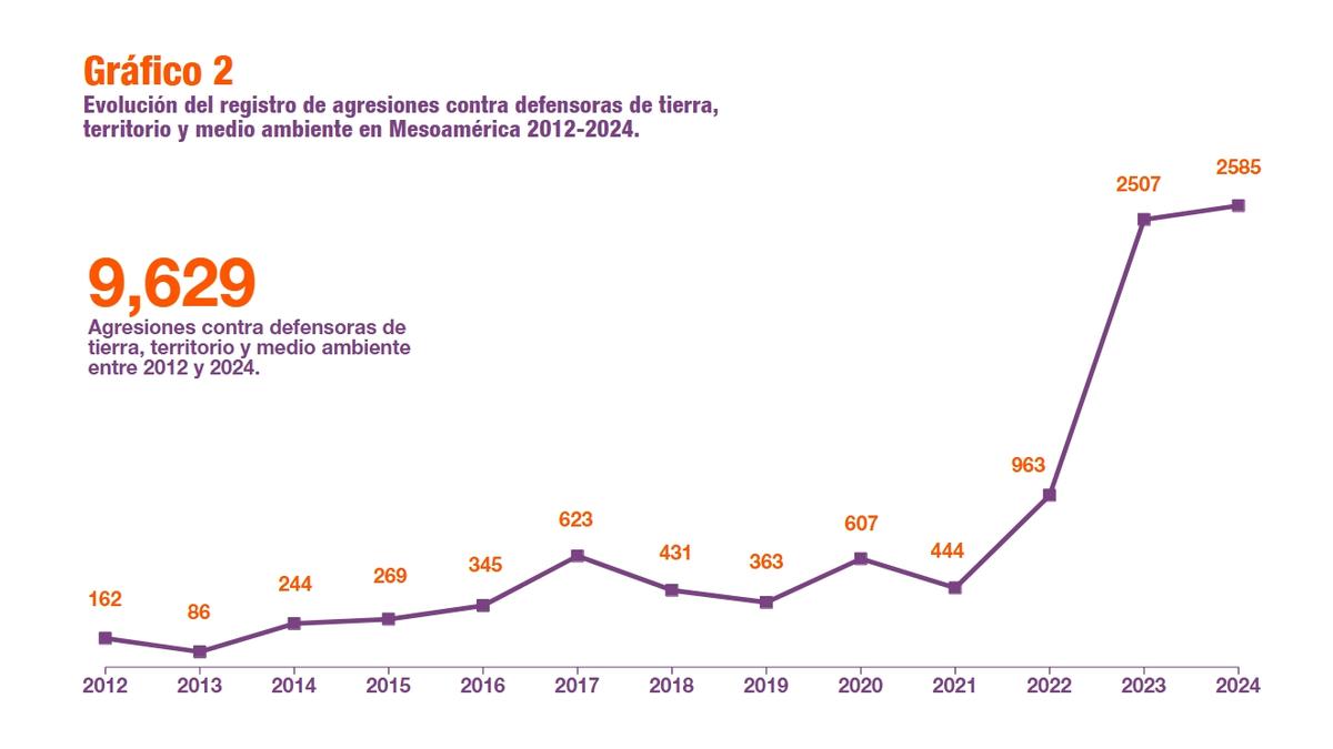 Entre 2012 y 2024 hemos documentado un total de 9,629 agresiones contra defensoras y organizaciones que defienden la tierra, el territorio y el medio ambiente en Mesoamérica. En el mismo periodo, 35 compañeras fueron asesinadas.