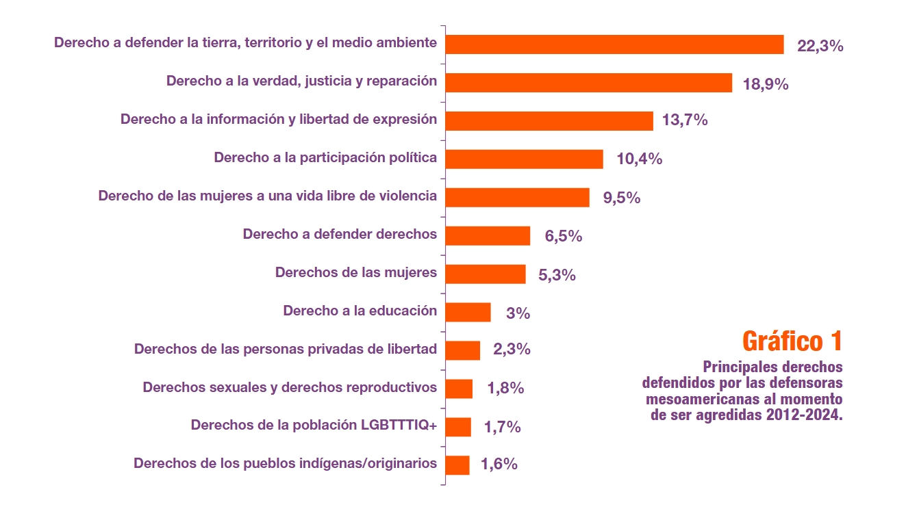 A lo largo de estos 13 años, como consecuencia directa del capitalismo extractivista que se impone en nuestros territorios, las defensoras de la tierra, el territorio y el medio ambiente han representado uno de los colectivos con mayor número de agresiones registradas, tal y como se desprende del hecho que 22,3% del total de las 43,186 agresiones contra defensoras que documentamos entre 2012 y 2024 en Mesoamérica fueron perpetradas contra compañeras que defendían estos derechos (Gráfico 1).