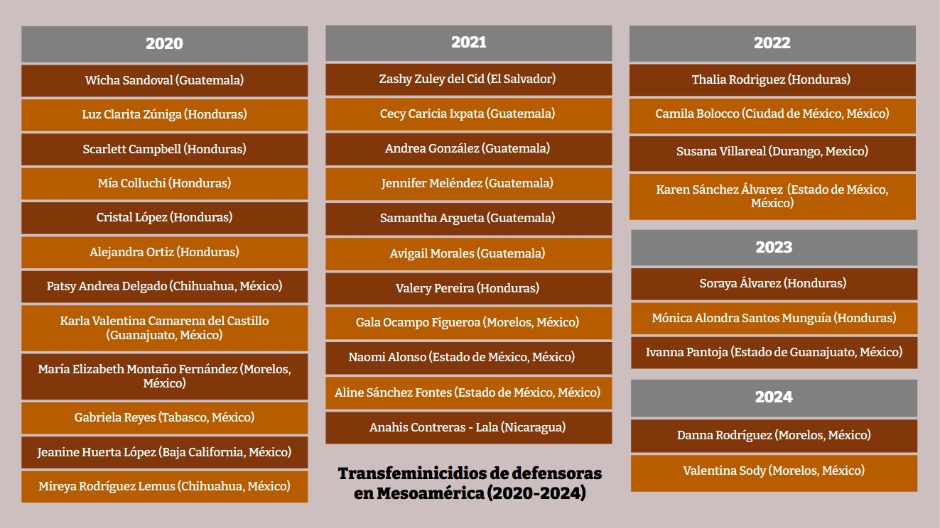 La situación de riesgo de las defensoras trans es especialmente alarmante, entre 2020 y 2024 registramos 32 transfemicidios/transfeminicidios de defensoras, lo que representa casi la mitad (40%) de los 80 asesinatos contra defensoras de derechos humanos que registramos en la región durante este periodo. Estas 32 compañeras fueron asesinadas por su doble condición de ser mujeres trans y defender derechos humanos.