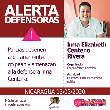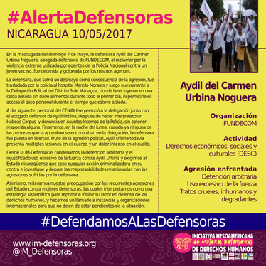 26 de mayo de 2016 - Desde hace 18 años Arelys del Carmen Cano Meza es defensora de los derechos humanos de las personas que conviven con el VIH. Actualmente es la representante para América Latina de la Comunidad Internacional de Mujeres con VIH (ICW - Latina).  En la madrugada del domingo 20 de marzo, el vehículo en el cual se transportaba Arelys con sus familiares fue detenido en un control de tránsito en Manuagua. Los policias ordenaron que todas las personas se bajaran del mismo y señalaron que lo enviarían al depósito municipal por supuesto aliento alcohólico del conductor.  Arelys reclamó a los policias que estaban haciendo un procedimiento arbitrario,  ya que primero tienen que hacer la prueba del alcoholimetro que lo confirme, estos la ofendieron y, seguidamente, en respuesta a la exigencia de la defensora de que se respetasen sus derechos, procedieron a detenerla arbitrariamente. Ante las quejas de la defensora por el abuso policial, un grupo de policías se abalanzó contra ella, la tiraron al suelo, la agredieron físicamente y la esposaron arrastándola hacia la patrulla policial, donde además de recbir una bufetada en la cara siguió siendo objeto de trato denigrante y burlas. A continuación la trasladaron a la Delegación de Policía. La agresión fue grabada por familiares y otras personas presentes, quienes posteriormente fueron obligadas a borrar las grabaciones y amenazados de ser también detenidos. Durante la detención, que duró 2 días, no le permitieron informar a sus familiares y la continuaron sometiendo a trato cruel, degradante e inhumano. Entre otros abusos le privaron de sus medicamentos, querían someterla  a desnudare para hacer sentadillas y luego ser objeto de un registro vaginal, al igual que el resto de mujeres detenidas. En la tarde del lunes 21 fue liberada tras una campaña de denuncia en Redes sociales y diversos medios de comunicación. Dos semanas después tuvo noticias de que el Ministerio Publico la había acusado por el delito de Obstrucción de funciones y en la audiencia inicial se admitió la misma y se programó el juicio para el próximo 27 de mayo. Cabe señalar que la acusación responsabiliza a Arelys de haber agredidos a los oficiales de policía y amenazarlos de contagio del VIH.   Desde la IM-Defensoras condenamos estos abusos y el trato degradante, cruel e inhumano de que ha sido víctima la defensora y exigimos a las autoridades nicaragüenses que garanticen su seguridad y su derecho a un proceso judicial apegado a ley, poniendo fin a su criminalización y depurando responsabildades para que hechos como los descritos no se vuelvan a repetir.