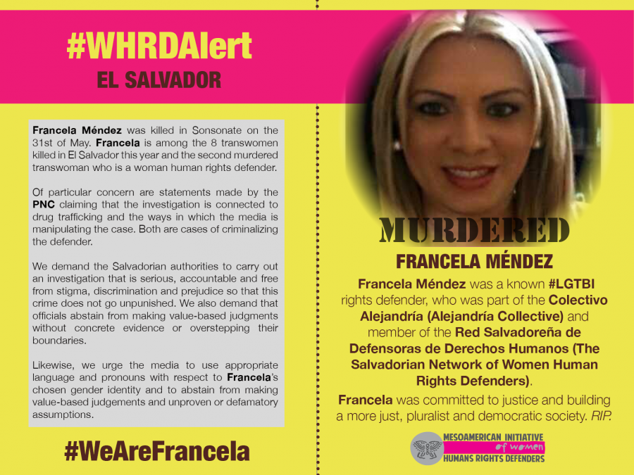 Francela Méndez was a known #LGTBI rights defender, who was part of the Colectivo Alejandría (Alejandría Collective) and member of the Red Salvadoreña de Defensoras de Derechos Humanos (The Salvadorian Network of Women Human Rights Defenders).