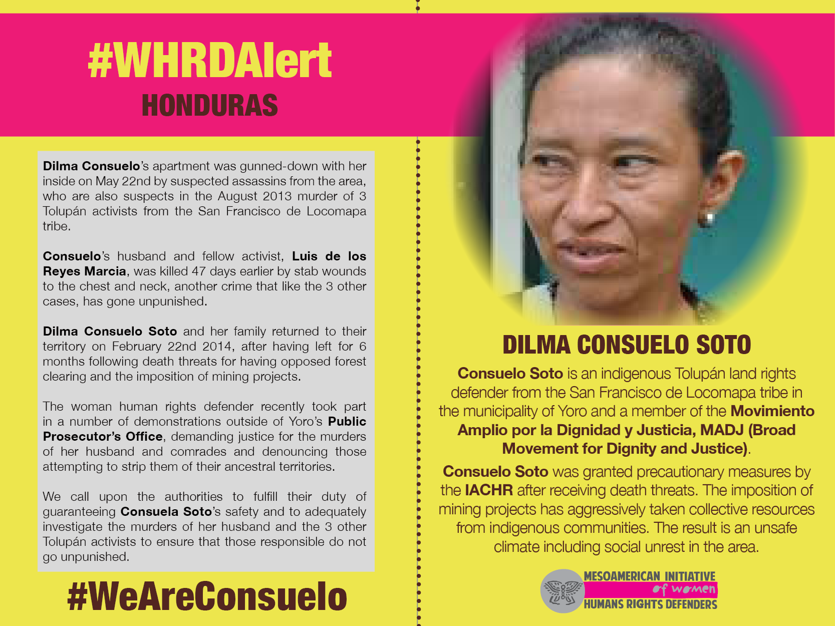 Consuelo Soto is an indigenous Tolupán land rights defender from the San Francisco de Locomapa tribe in the municipality of Yoro and a member of the Movimiento Amplio por la Dignidad y Justicia, MADJ (Broad Movement for Dignity and Justice).
