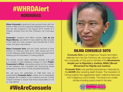 We call upon the authorities to fulfill their duty of guaranteeing Consuela Soto’s safety and to adequately investigate the murders of her husband and the 3 other Tolupán activists to ensure that those responsible do not go unpunished.