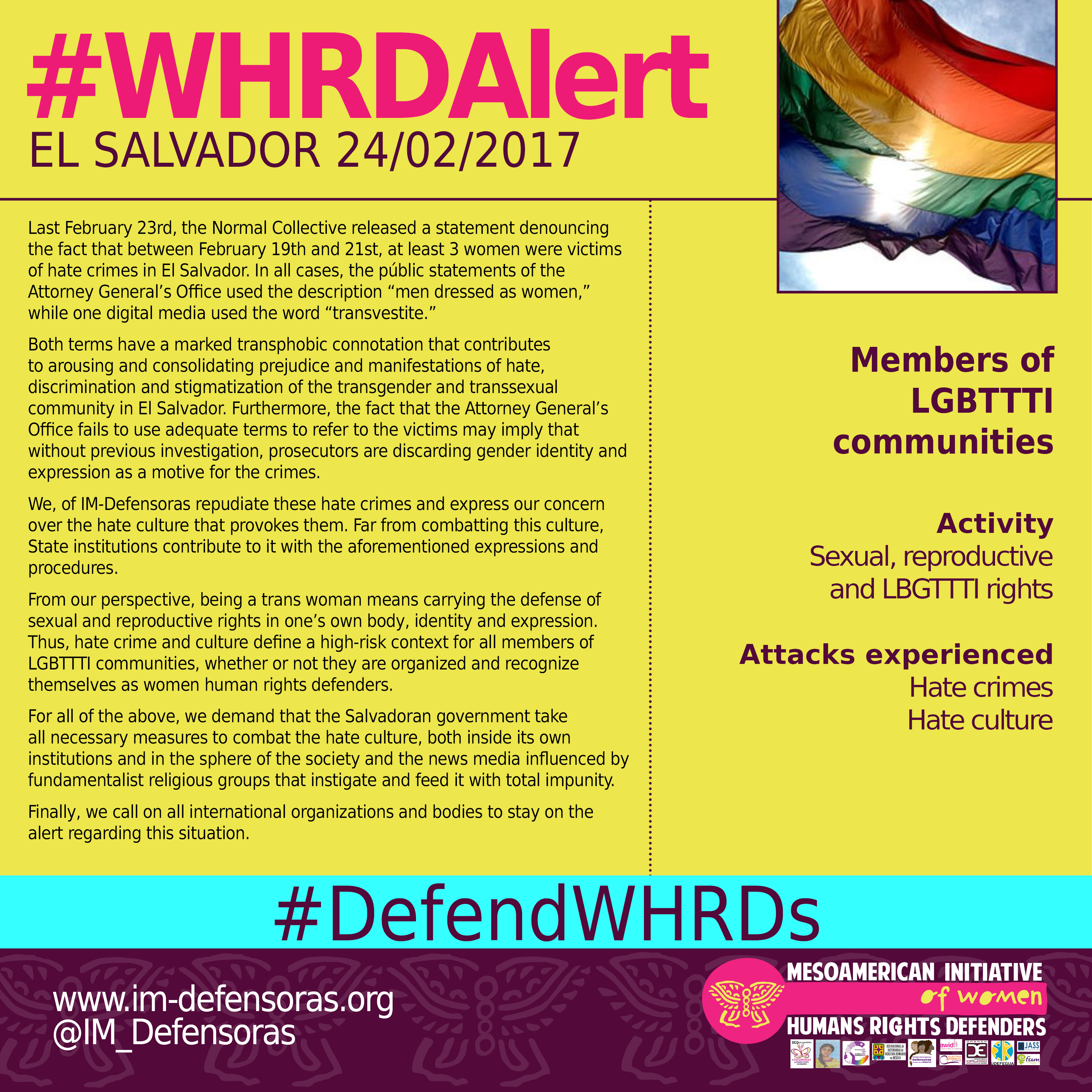 We, of IM-Defensoras repudiate these hate crimes and express our concern over the hate culture that provokes them. Far from combatting this culture, State institutions contribute to it with the aforementioned expressions and procedures.
