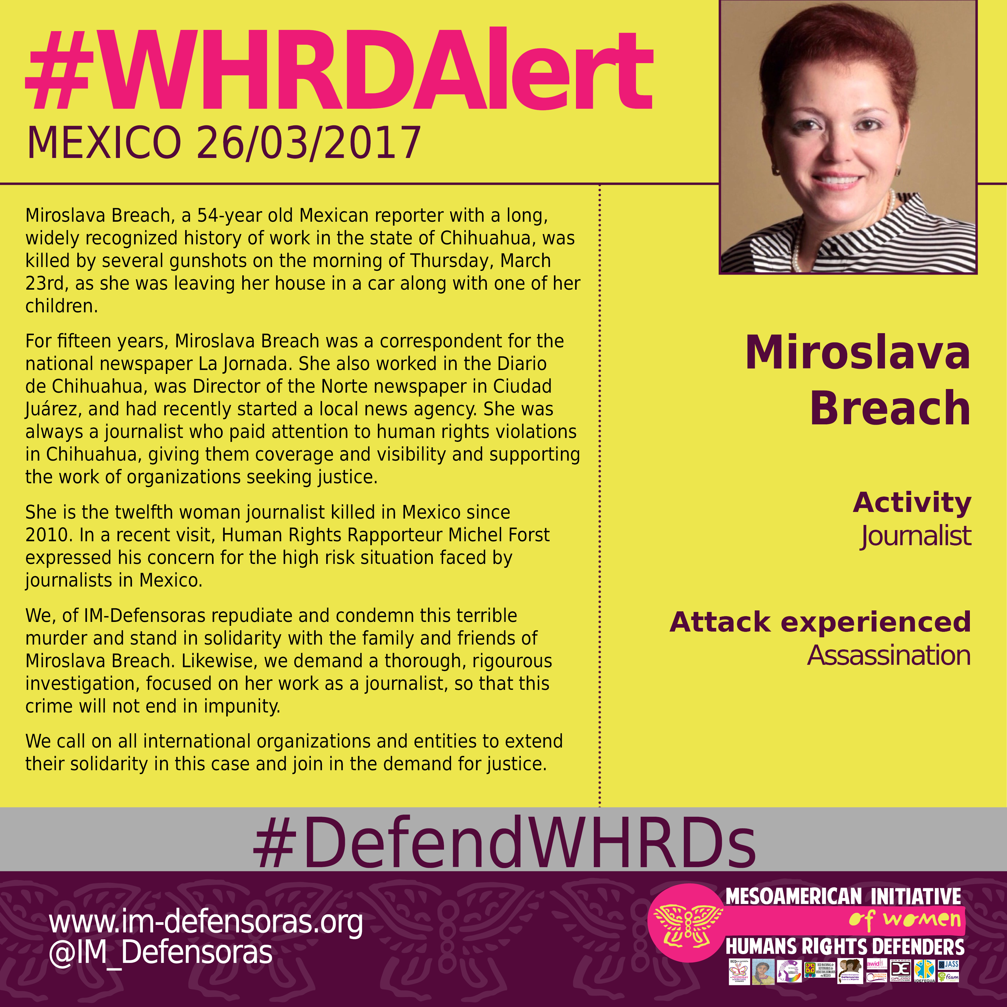 We, of IM-Defensoras repudiate and condemn this terrible murder and stand in solidarity with the family and friends of Miroslava Breach. Likewise, we demand a thorough, rigourous investigation, focused on her work as a journalist, so that this crime will not end in impunity.