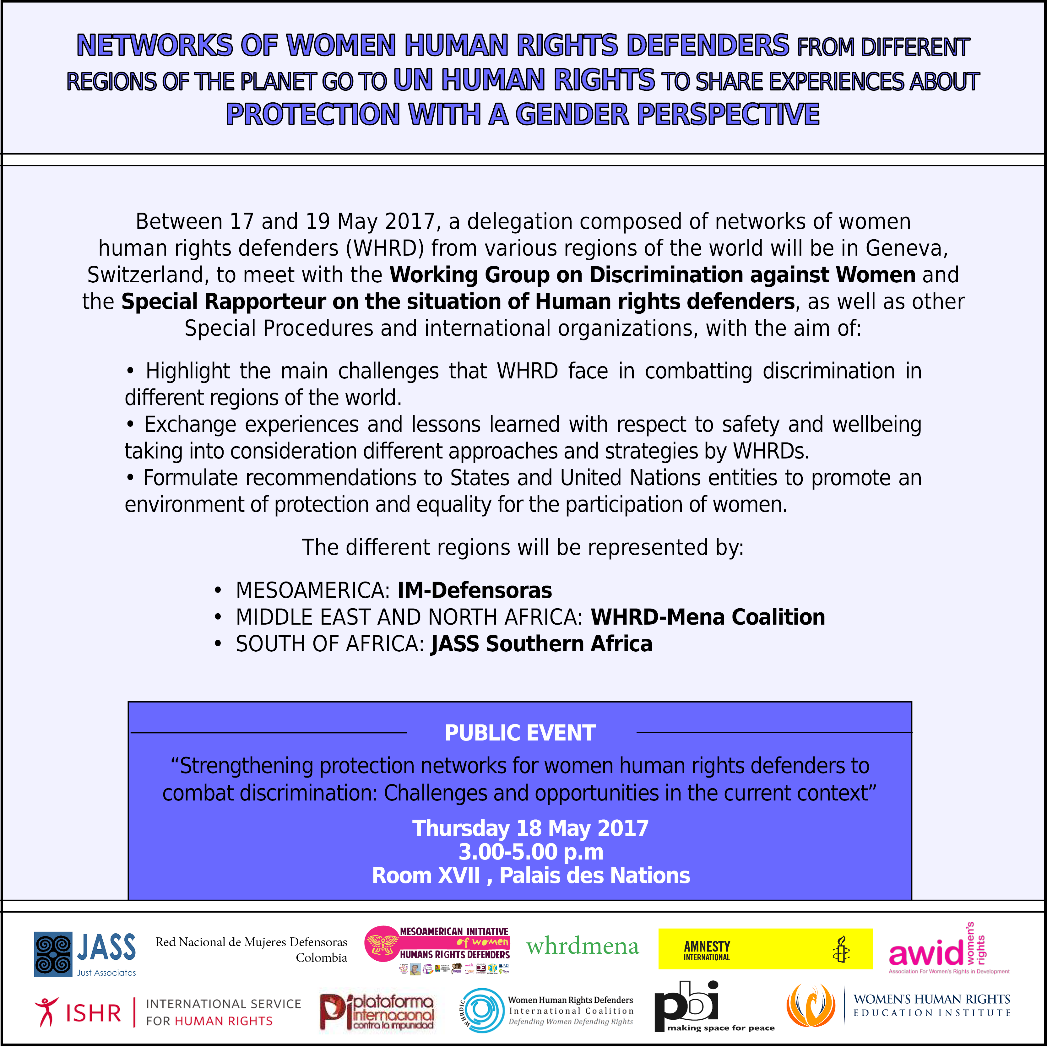 Between 17 and 19 May 2017, a delegation composed of networks of women human rights defenders (WHRD) from various regions of the world will be in Geneva, Switzerland, to meet with the Working Group on Discrimination against Women and the Special Rapporteur on the situation of Human rights defenders, as well as other Special Procedures and international organizations, with the aim of: