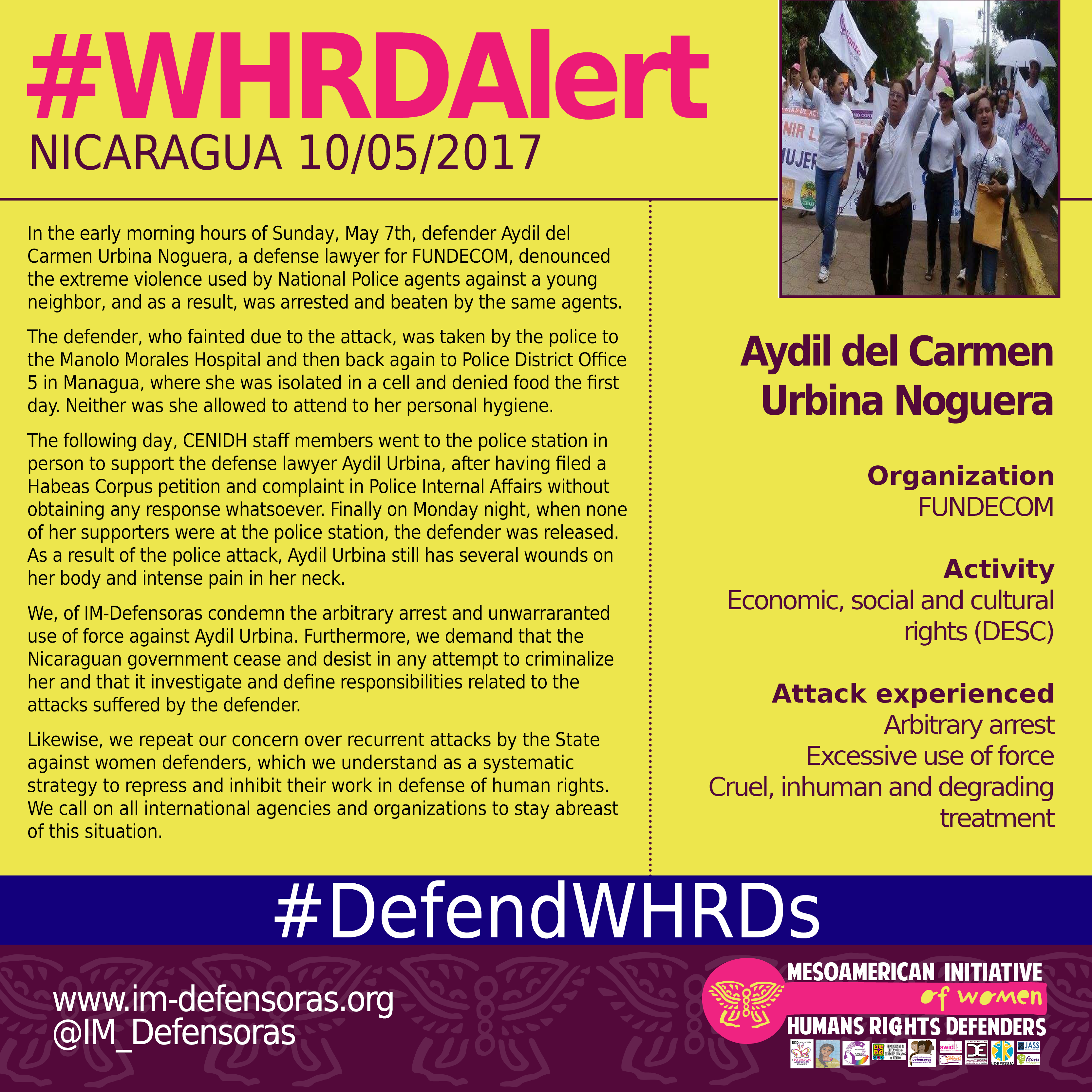 We, of IM-Defensoras condemn the arbitrary arrest and unwarraranted use of force against Aydil Urbina. Furthermore, we demand that the Nicaraguan government cease and desist in any attempt to criminalize her and that it investigate and define responsibilities related to the attacks suffered by the defender.