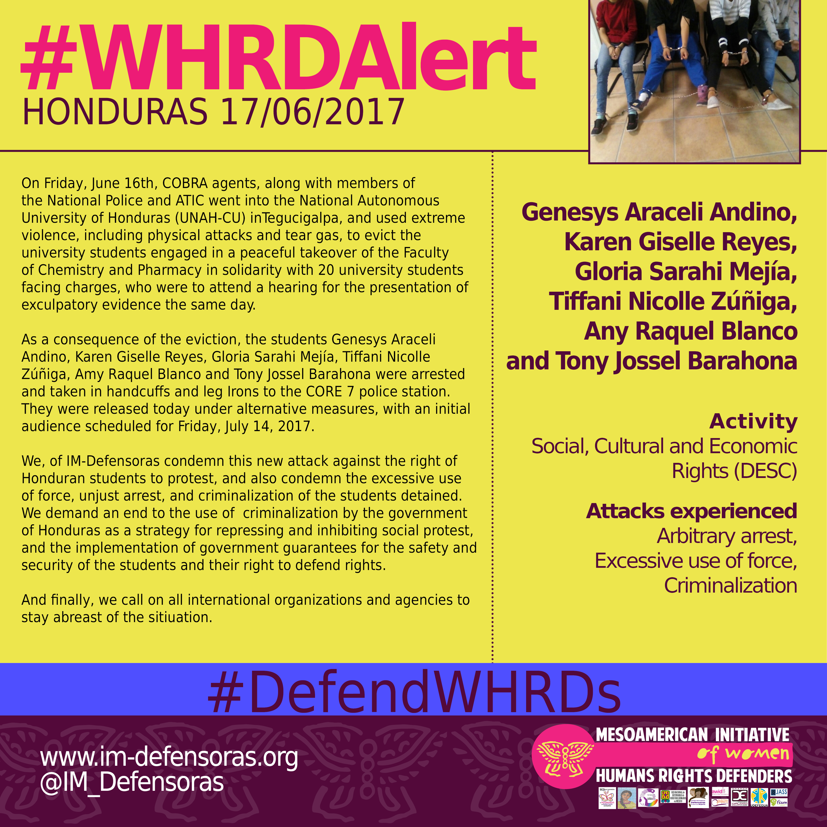 As a consequence of the eviction, the students Genesys Araceli Andino, Karen Giselle Reyes, Gloria Sarahi Mejía, Tiffani Nicolle Zúñiga, Amy Raquel Blanco and Tony Jossel Barahona were arrested and taken in handcuffs and leg Irons to the CORE 7 police station. They were released today under alternative measures, with an initial audience scheduled for Friday, July 14, 2017.