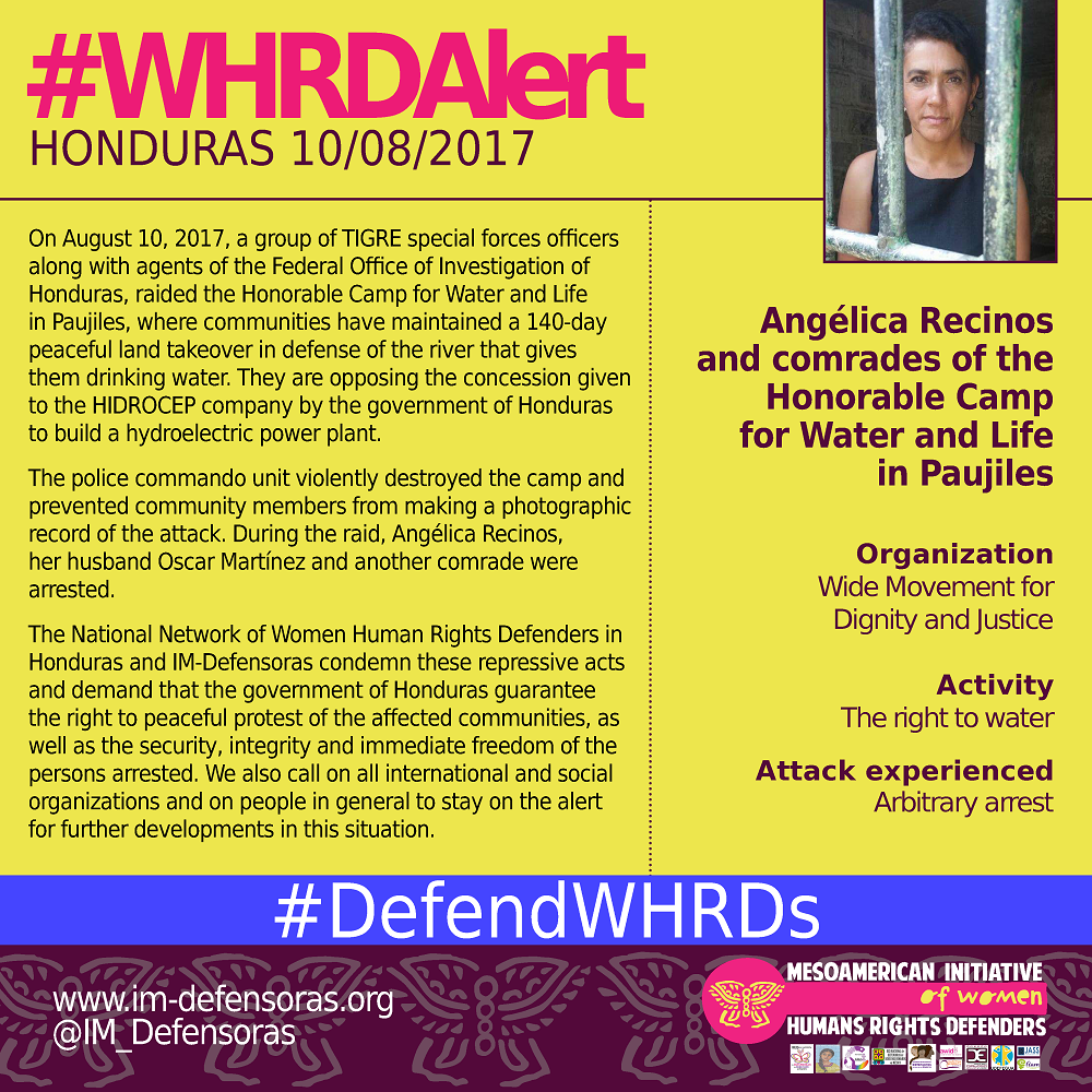 The National Network of Women Human Rights Defenders in Honduras and IM-Defensoras condemn these repressive acts and demand that the government of Honduras guarantee the right to peaceful protest of the affected communities, as well as the security, integrity and immediate freedom of the persons arrested. We also call on all international and social organizations and on people in general to stay on the alert for further developments in this situation.