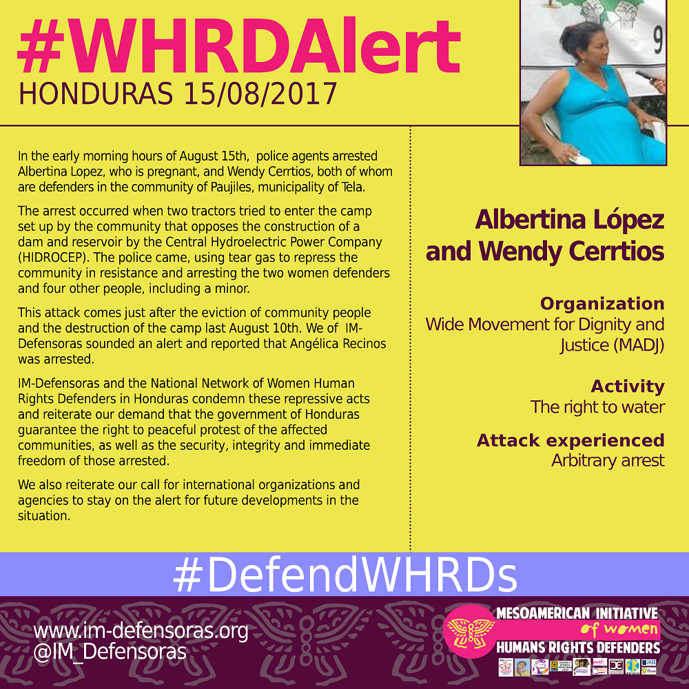 THE FACTS – In the early morning hours of August 15th, police agents arrested Albertina Lopez, who is pregnant, and Wendy Cerrtios, both of whom are defenders in the community of Paujiles, municipality of Tela.