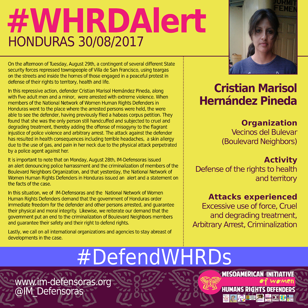 In this repressive action, defender Cristian Marisol Hernández Pineda, along with five adult men and a minor, were arrested with extreme violence. When members of the National Network of Women Human Rights Defenders in Honduras went to the place where the arrested persons were held, the were able to see the defender, having previously filed a habeas corpus petition. They found that she was the only person still handcuffed and subjected to cruel and degrading treatment, thereby adding the offense of misogyny to the flagrant injustice of police violence and arbitrary arrest. The attack against the defender has resulted in health consequences including terrible headaches, a skin allergy due to the use of gas, and pain in her neck due to the physical attack perpetrated by a police agent against her.