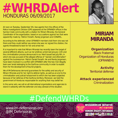 We of IM-Defensoras demand guarantees for the safety and security of Miriam Miranda and for her right to defend rights, as well as an end to the criminalization and judicial harassment to which she has been subjected because of her defense of the Garifuna territory. Moreover, we hold the government of Honduras responsable for anything that may befall her.
