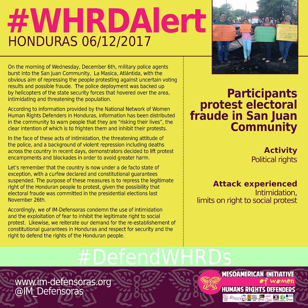 Accordingly, we of IM-Defensoras condemn the use of intimidation and the exploitation of fear to inhibit the legitimate right to social protest. Likewise, we reiterate our demand for the re-establishement of constitutional guarantees in Honduras and respect for security and the right to defend the rights of the Honduran people.