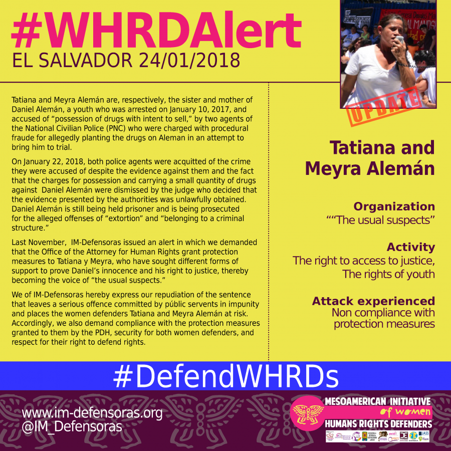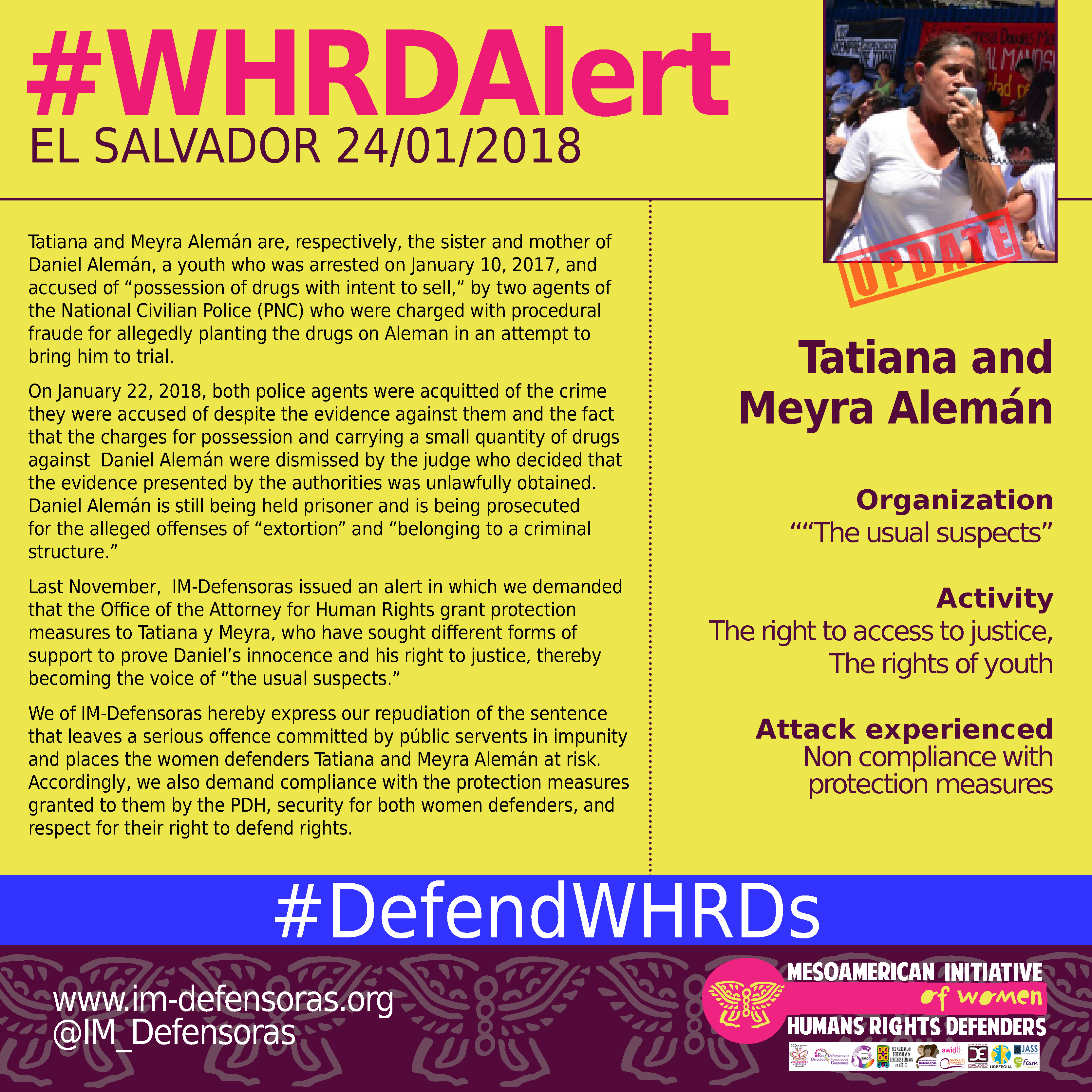 We of IM-Defensoras hereby express our repudiation of the sentence that leaves a serious offence committed by públic servents in impunity and places the women defenders Tatiana and Meyra Alemán at risk. Accordingly, we also demand compliance with the protection measures granted to them by the PDH, security for both women defenders, and respect for their right to defend rights.