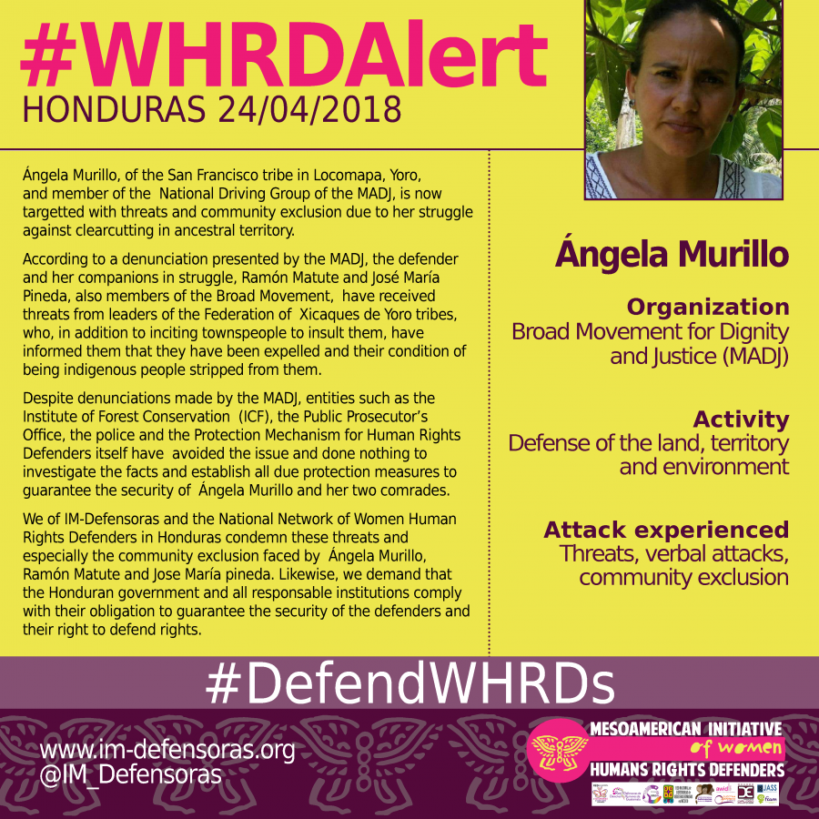 We of IM-Defensoras and the National Network of Women Human Rights Defenders in Honduras condemn these threats and especially the community exclusion faced by Ángela Murillo, Ramón Matute and Jose María pineda. Likewise, we demand that the Honduran government and all responsable institutions comply with their obligation to guarantee the security of the defenders and their right to defend rights.