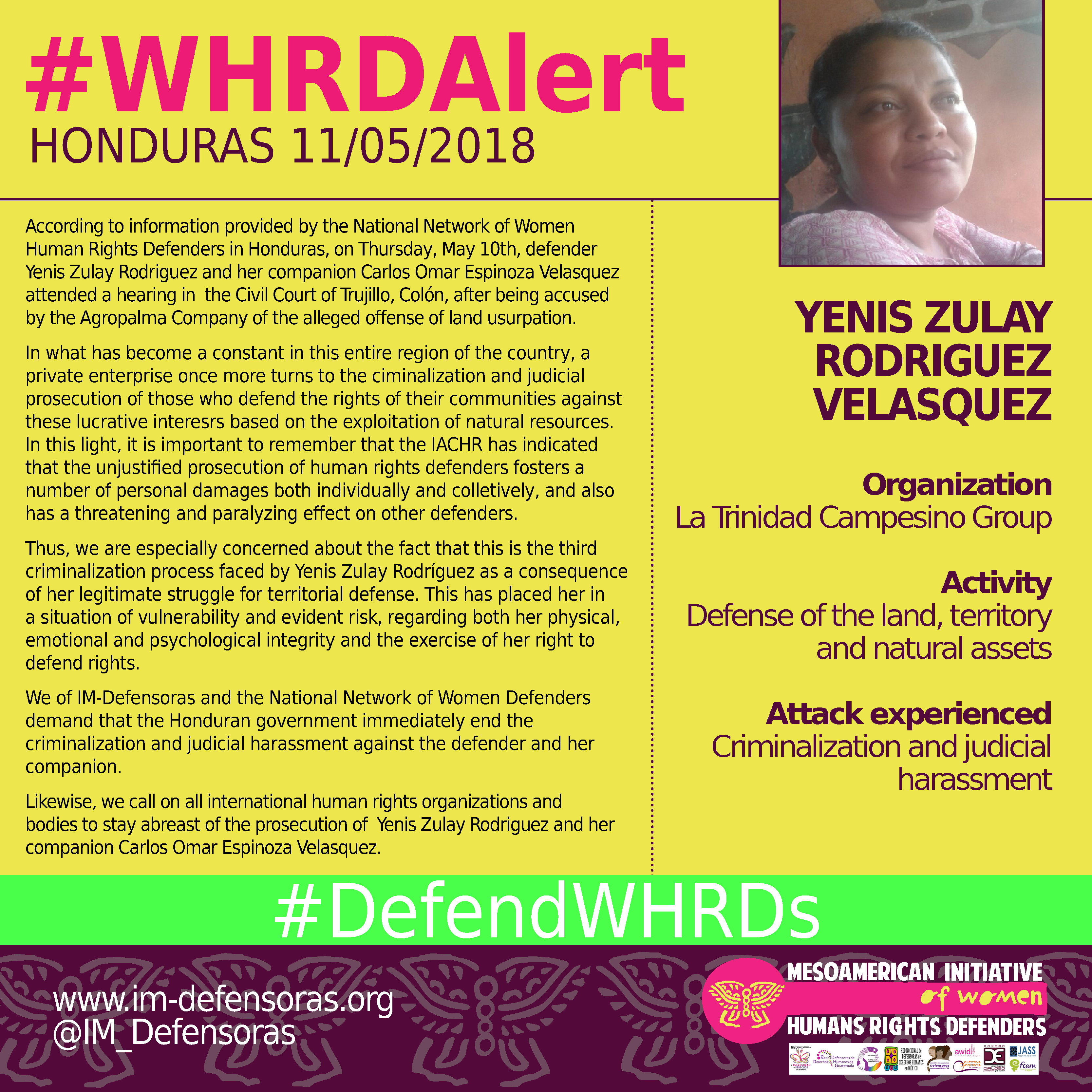 THE FACTS – According to information provided by the National Network of Women Human Rights Defenders in Honduras, on Thursday, May 10th, defender Yenis Zulay Rodriguez and her companion Carlos Omar Espinoza Velasquez attended a hearing in the Civil Court of Trujillo, Colón, after being accused by the Agropalma Company of the alleged offense of land usurpation.