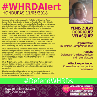 We of IM-Defensoras and the National Network of Women Defenders demand that the Honduran government immediately end the criminalization and judicial harassment against the defender and her companion.