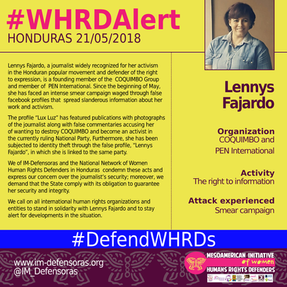 THE FACTS – Lennys Fajardo, a journalist widely recognized for her activism in the Honduran popular movement and defender of the right to expression, is a founding member of the COQUIMBO Group and member of PEN International. Since the beginning of May, she has faced an intense smear campaign waged through false facebook profiles that spread slanderous information about her work and activism.