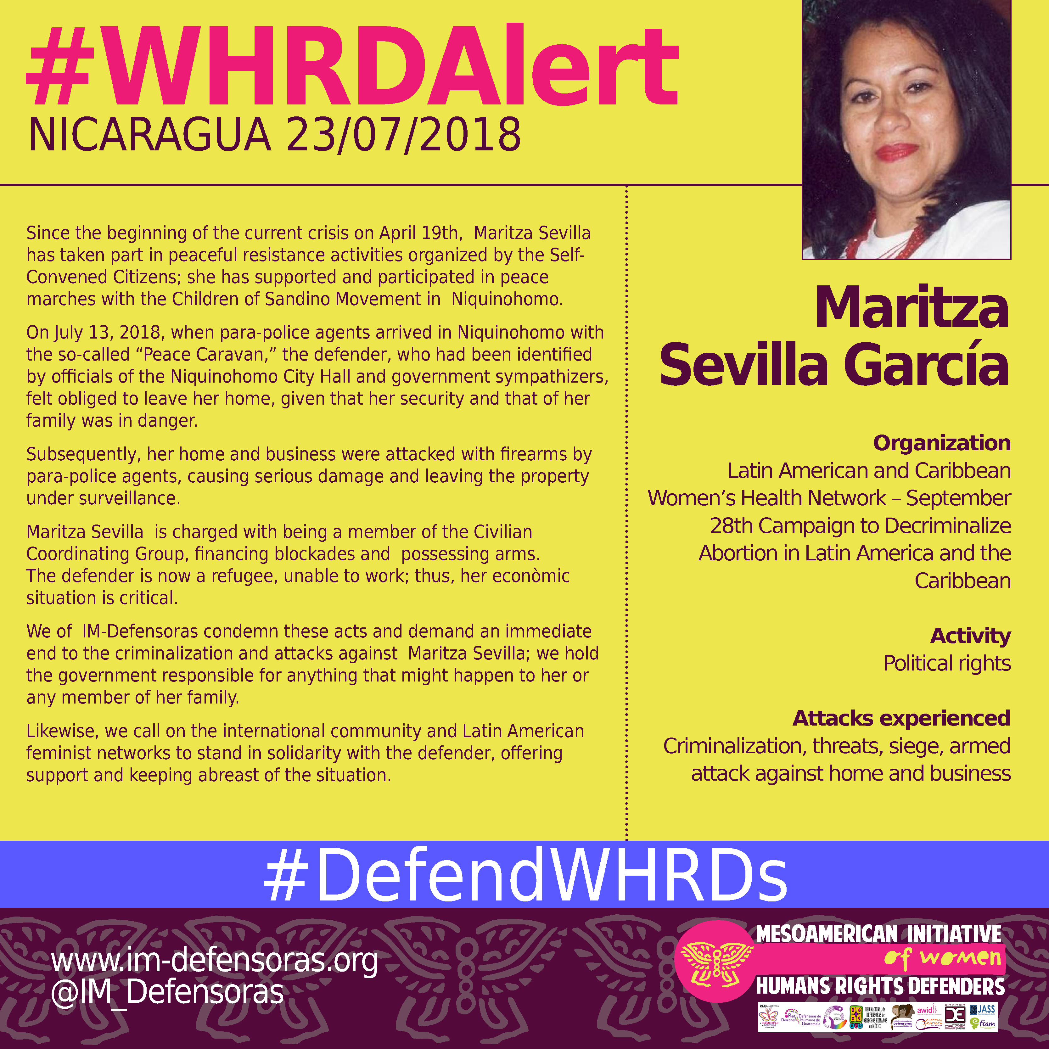 We of IM-Defensoras condemn these acts and demand an immediate end to the criminalization and attacks against Maritza Sevilla; we hold the government responsible for anything that might happen to her or any member of her family.