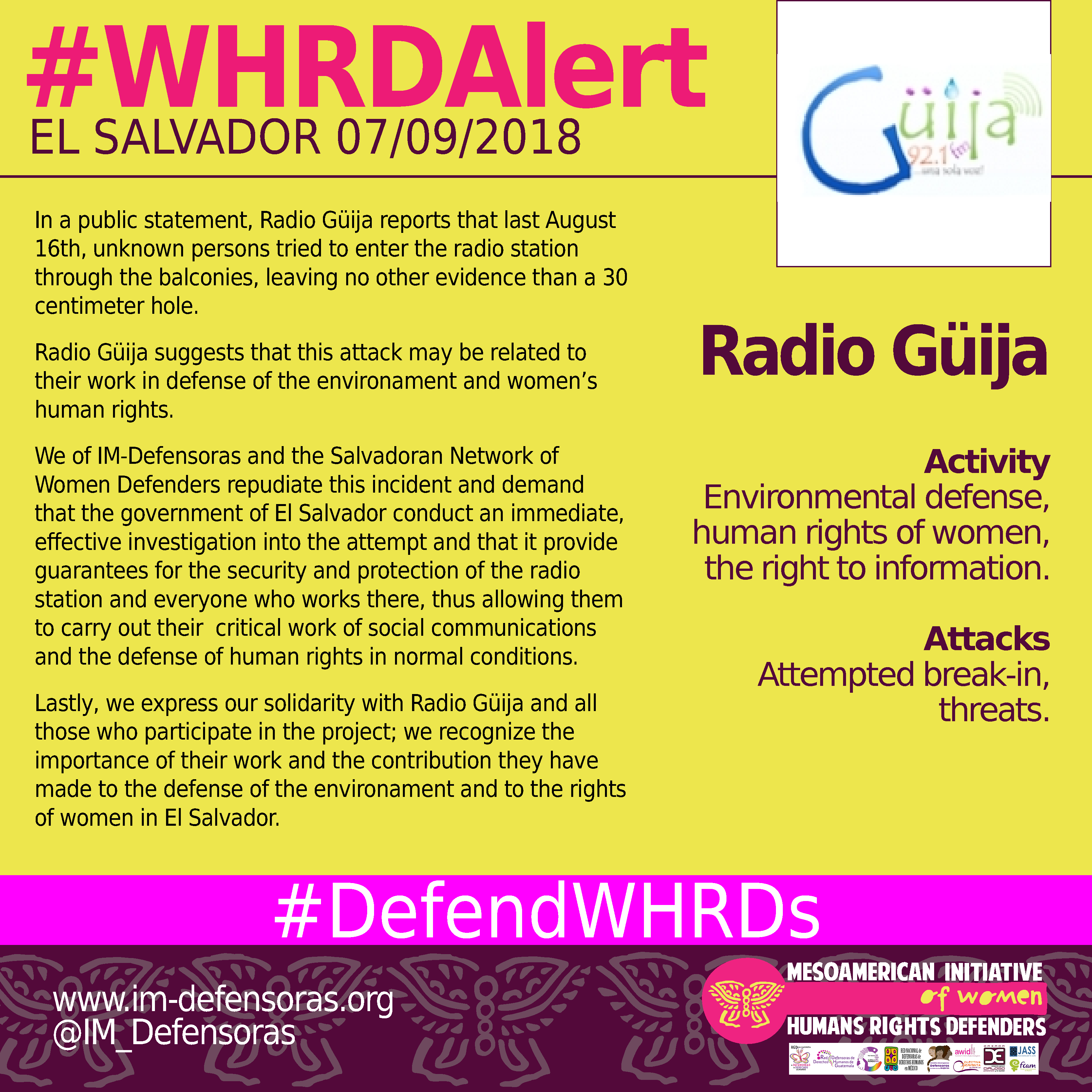 We of IM-Defensoras and the Salvadoran Network of Women Defenders repudiate this incident and demand that the government of El Salvador conduct an immediate, effective investigation into the attempt and that it provide guarantees for the security and protection of the radio station and everyone who works there, thus allowing them to carry out their critical work of social communications and the defense of human rights in normal conditions.