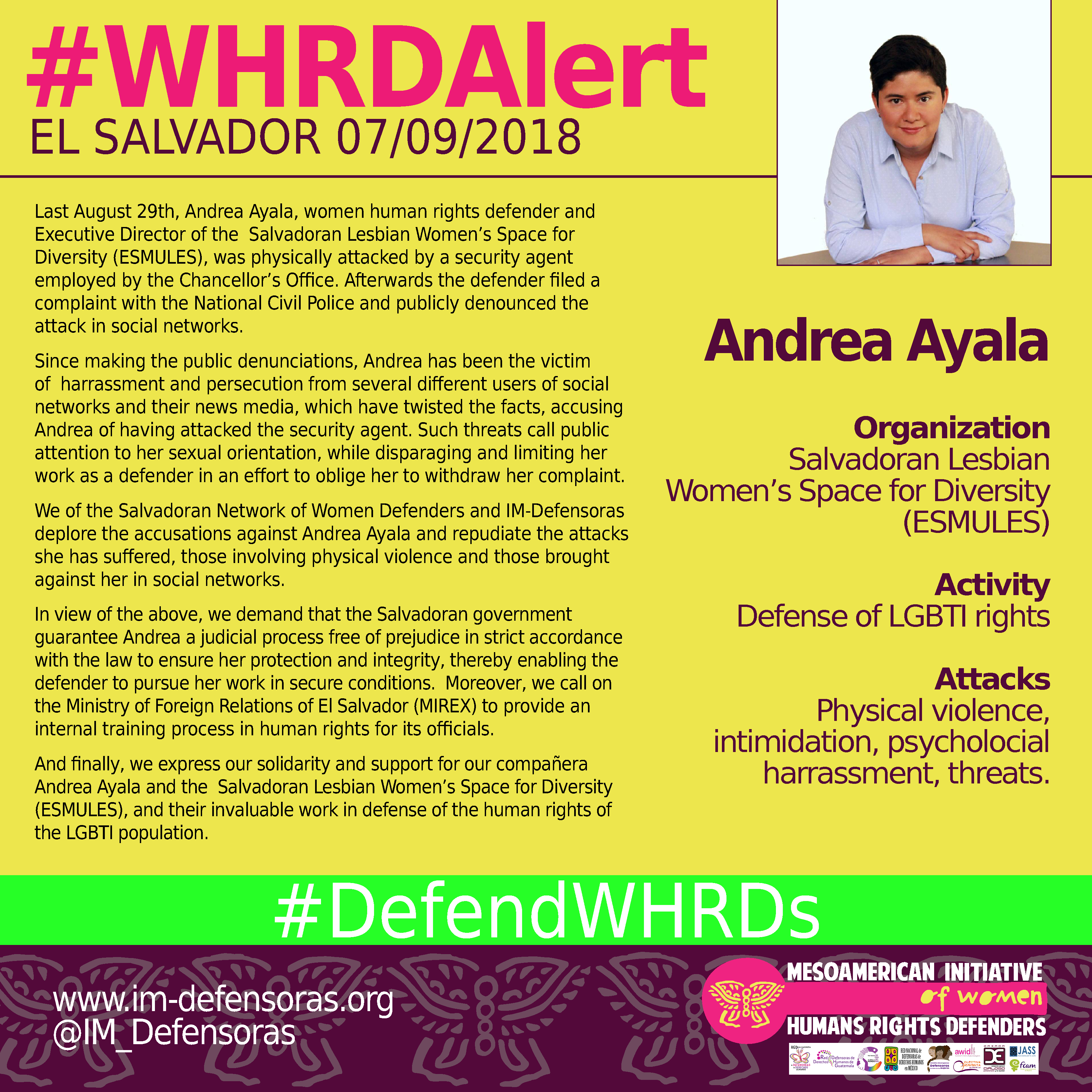 THE FACTS – Last August 29th, Andrea Ayala, women human rights defender and Executive Director of the Salvadoran Lesbian Women’s Space for Diversity (ESMULES), was physically attacked by a security agent employed by the Chancellor’s Office. Afterwards the defender filed a complaint with the National Civil Police and publicly denounced the attack in social networks.