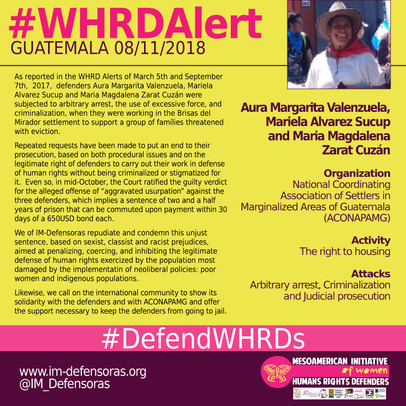 THE FACTS – As reported in the WHRD Alerts of March 5th and September 7th, 2017, defenders Aura Margarita Valenzuela, Mariela Alvarez Sucup and Maria Magdalena Zarat Cuzán were subjected to arbitrary arrest, the use of excessive force, and criminalization, when they were working in the Brisas del Mirador settlement to support a group of famílies threatened with eviction.
