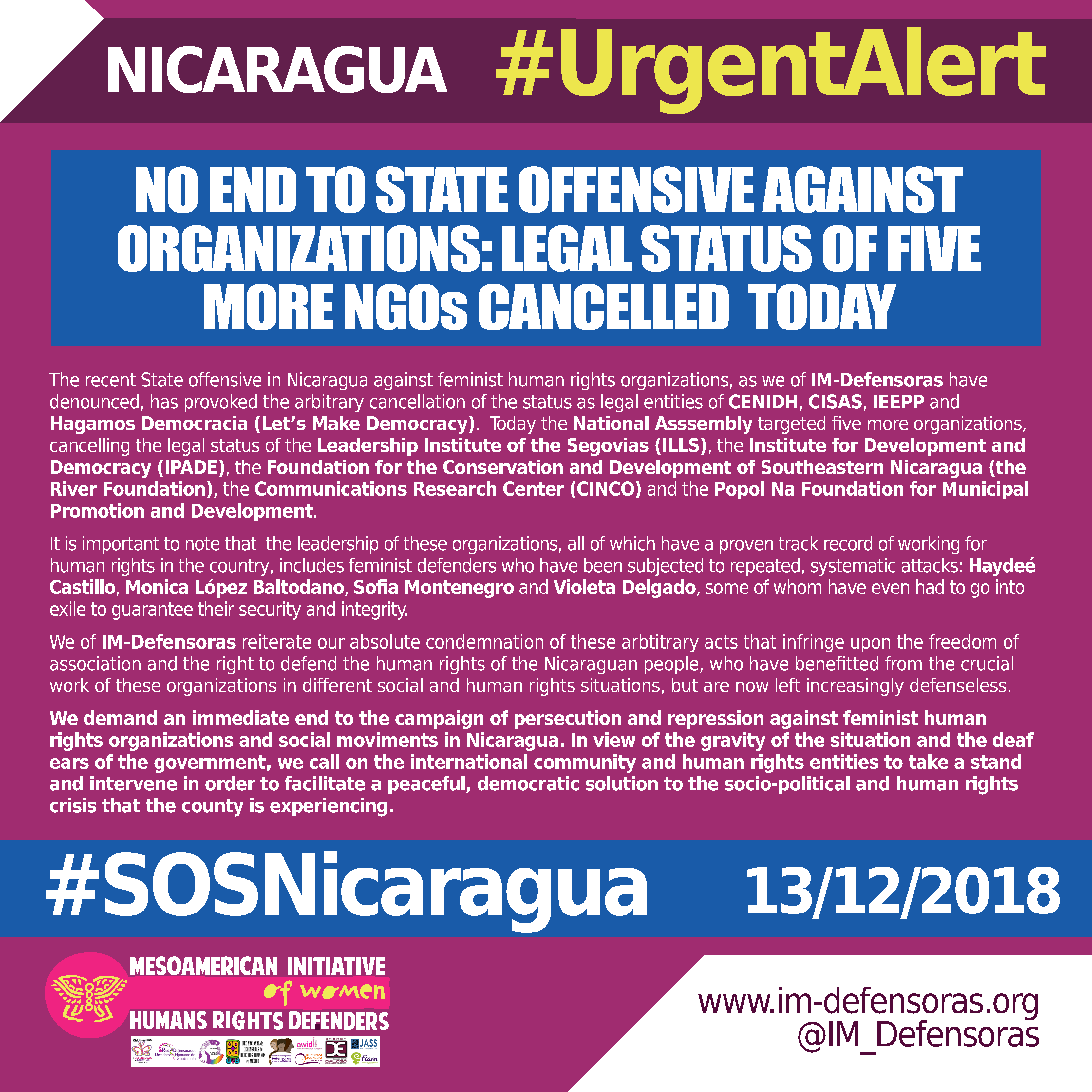 The recent State offensive in Nicaragua against feminist human rights organizations, as we of IM-Defensoras have denounced, has provoked the arbitrary cancellation of the status as legal entities of CENIDH, CISAS, IEEPP and Let’s Make Democracy. Today the National Asssembly targeted five more organizations, cancelling the legal status of the Leadership Institute of the Segovias (ILLS), the Institute for Development and Democracy (IPADE), the Foundation for the Conservation and Development of Southeastern Nicaragua (the River Foundation), the Communications Research Center (CINCO) and the Popol Na Foundation for Municipal Promotion and Development.